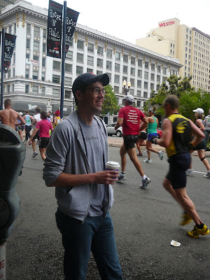 We're back from Southern California and ready to share stories and pics! We had such a good time with family and friends and have so much to tell that I think it is best if we break the posts up by region. Starting with San Diego... Kelley: The big highlight of our time in SD was seeing Scott and Jeni run the Rock & Roll Marathon. Chris and I got up bright and early to scout out a spot downtown, right around mile 7. We had our eyes peeled for our two as plenty of runners in Elvis costumes and other silly get-ups ran. Soon enough Jeni comes by all smiles and with plenty of positive energy. We snapped some photos and away she went. Not far behind was Scott. He flashed us a quick thumbs-up but kept on going. Chris: Before stopping, Jeni navigated her way through the crowd and into their hotel (which was right at this spot) for a bathroom break. Scott blew us off for photos, but then initiated an exchange of text messages. I suppose these both are examples of thinking on your feet. Kelley: From there we headed to breakfast and then on to camp out at mile 24. We were sure they would need our encouragement that late in the game (neither of us having run a marathon, we could only imagine what their state of mind would be) and not long after our arrival we saw a pretty fit man begging his wife to let him quit. But pretty soon here comes Jeni, still all smiles and upset only that her time wasn't up to her own high standard. Chris: We took the trolley over near Old Town, which annoyed me in its resemblance to Disneyland's Frontierland. After a short walk to the course we were eager to spot Jeni, but it proved difficult to accurately pick anyone out of the heedless river of runners. Indeed, we first misidentified six or seven women (and, in my case, embarrassingly, one man). Sorry, Jen. Kelley: After she goes by, we start scouring the crowd for Scott. His goal time was a little slower, so we're thinking he can't be far behind. Ten minutes pass, then 20, 30, 40. Then a juggler goes by, and we snap a photo with the idea of teasing Scott later on about his slowness. Then an ambulance goes by and I start going over worst-case scenarios in my head. Finally, around noon, at least an hour after Jeni has passed, we head to the finish line... where we find Scott. All the while we were expecting Jeni to be first, Scott managed to pass us and get the better time! Chris: Scott was slightly less than a gracious winner. When he got Jeni on the phone and found out that his time was quicker than hers, he shouted something along the lines of "Yeeaaahh! That's what I'm talking 'bout!". Thirty-six, Joe. You're 36. Kelley: Then after they had run 26.2 miles (!) we all went out for burgers and beers, first on Coronado Island and then downtown. We had such a good time just hanging out. But it has to be said how impressed Chris and I were by their absolutely positive attitudes. Well done, guys. Chris: I was impressed as well by Scott's wolfing of another burger, this one from Wendy's, before retiring for the night. Kelley: The next day we capped our visit with breakfast at Hash House A Go-Go, a breakfast place in San Diego I had heard great things about. The recommendation was right -- it was delicious -- but the portions were enormous. Chris ordered a Snickers flapjack (that's right) the size of huge frying pan and we all had a bite. If you can't recognize my giant-sized dish, that is eggs Benedict. Chris: "A bite" = yum. A second bite = ick. Kelley: After we said farewell to Scott and Jeni, Chris and I stopped at beautiful Balboa Park before heading up the coast. We hit the beach in La Jolla and Torrey Pines Golf Course as well, and then it was on to the beach town of San Clemente for dinner with our friends Brittany and Noah. Their apartment sits over a bunch of surf shops and is a short walk from the beach. Absolutely charming! Chris: Balboa Park's campus of attractions is bountiful and diverse -- museums of art, anthropology, local history; a botanical garden; the famous zoo -- and there are many spots for just lazing about. The mix is really quite clever. And I'll echo Kelley's thoughts on San Clemente. It oughta give Seattle a run for its money, you two. View all the pictures from this leg of our trip here. And have a look at Scott's version of events here. Next up: Our adventures in Los Angeles! |